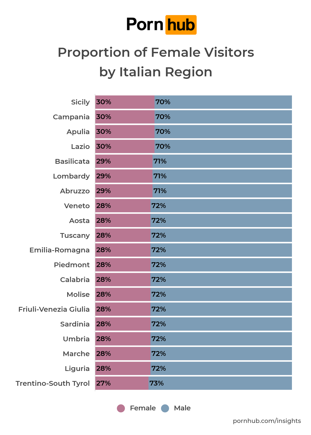 Il primo dato non è poi così sorprendente: in media sono molto più gli uomini ad utilizzare Pornhub rispetto alle donne. In quasi ogni regione italiana si registra circa il 30% di utenti donne, una percentuale leggermente sotto la media mondiale. Pornhub fornisce inoltre una classifica dettagliata delle categorie più cercate regione per regione dagli utenti donna. Se in Sicilia ad esempio la categoria 'feet' è cercata in media il 141% di volte in più rispetto alle altre regioni, in Liguria si ricercano molto video con toys, mentre in Calabria va molto l'hardcore. O ancora, in Abruzzo si ricercano moltissimo video tra coppie interraziali, in Basilicata a dominare è la categoria 'italian', mentre in Lombardia spiccano la sezione 'trans with guy' e 'trans with girl'.