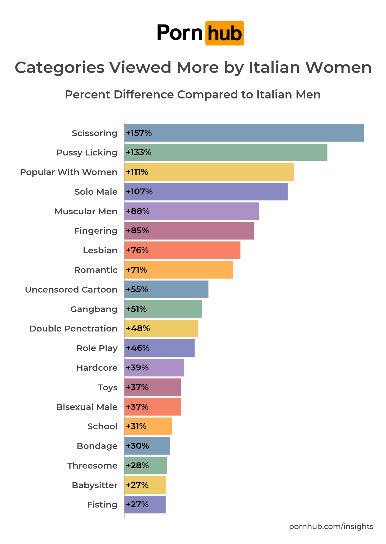 Tra le categorie più cercate dagli utenti donna rispetto agli utenti uomini in Italia, dominano 'scissoring', 'pussy licking', 'popular with women', ma anche 'fingering' e 'lesbian', tutte categorie che mettono al centro il piacere femminile. L'industria del porno è rimasta a lungo appannaggio dell'universo maschile anche per il modo in cui la donna e il suo corpo venivano rappresentati: non solo fisici irrealistici e chirurgicamente rifatti, in cui è difficile immedesimarsi, ma anche rapporti sessuali in cui il climax consiste solo nell'orgasmo maschile e in cui la donna ha la sola funzione di portare l'uomo a quel culmine. In questo tipo di visione il piacere femminile è rimasto sempre secondario, e la donna quasi sottomessa, mentre il successo di una categoria come il 'scissoring' rivela come gli utenti donna vogliano vedere rappresentato, in modo realistico, il vero piacere femminile.