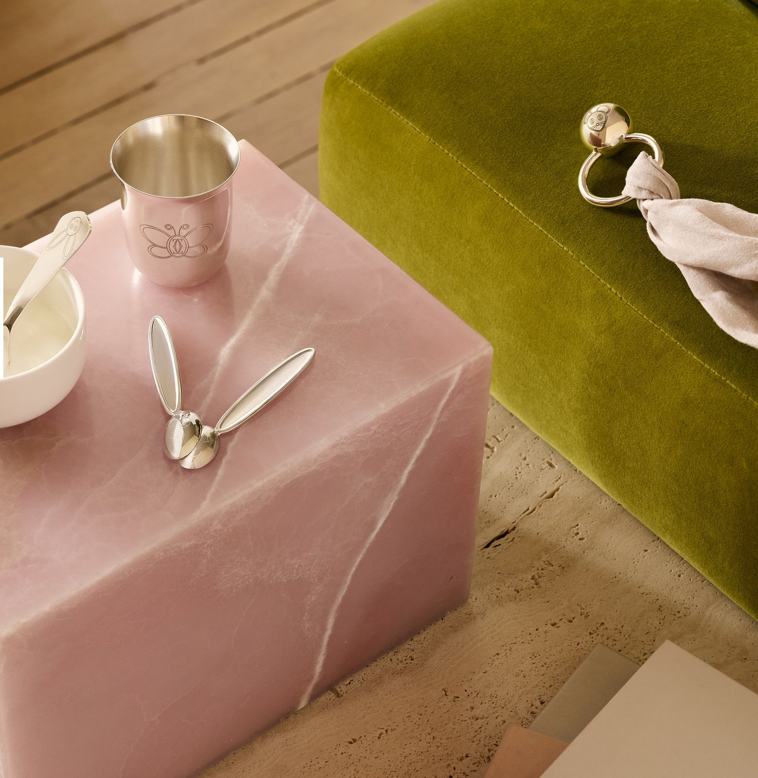 Farfalle, conigli, panda e volpi stilizzati spuntano su portauova, sonagli, bicchieri, cornici in argento e plaid in cachemire; mentre gli altri simboli di Cartier rendono ancora più unici e speciali quaderni, astucci, porcellane, set per solitario, cubi da gioco, carillon, salvadanai, targhette in metallo per personalizzare le valigie, portagioie e portachiavi.