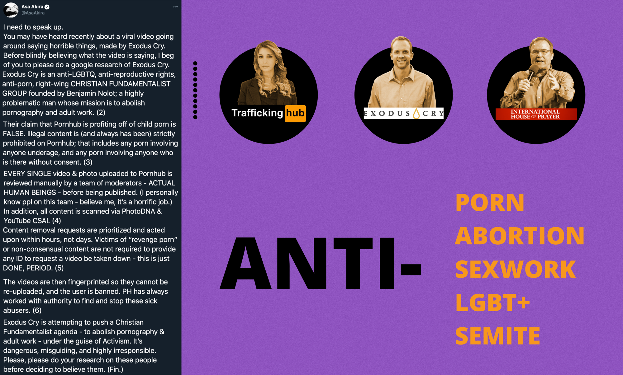 ExodusCry è un’organizzazione religiosa di destra, anti-LGBT+, contraria ai diritti riproduttivi (come l'aborto e la pillola anticoncezionale), abolizionista di ogni tipo di pornografia e sex-work - questa parola in realtà non viene pronunciata quasi mai, ma ci si rivolge al lavoro sessuale solo parlando di “prostituzione” e “schiavitù”. Questo perché l’organizzazione sostiene il modello nordico abolizionista e non la decriminalizzazione. I membri inoltre ritengono che il porno sia la causa del traffico sessuale e in generale della tratta degli esseri umani (da loro considerata la fine dei tempi); e per questo propongono di intraprendere una nuova guerra santa. Inoltre sia Mickelwait che Nolot hanno forti legami con l’IHOPKC (il ministero evangelico International House of Prayer Kansas City), il cui pastore, Mike Bickle, ha più volte portato avanti affermazioni omofobe e antisemite. Queste tre realtà sono collegate tra di loro e negli anni hanno cercato di edulcorare le loro campagne, eliminando dai loro siti i riferimenti più estremisti (sia da un punto di vista religioso che politico), e proponendo una comunicazione sui social più catchy e giovanile. Con il suo articolo, Kristof da un lato ha diffuso la loro ideologia nel mainstream, dall’altro ha anche fornito particolari più che precisi al pubblico per effettuare le ricerche che lui stesso denuncia.