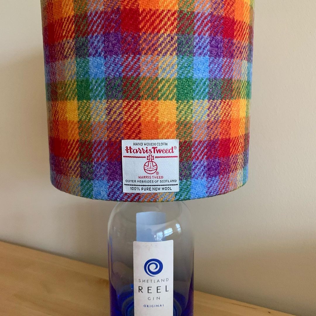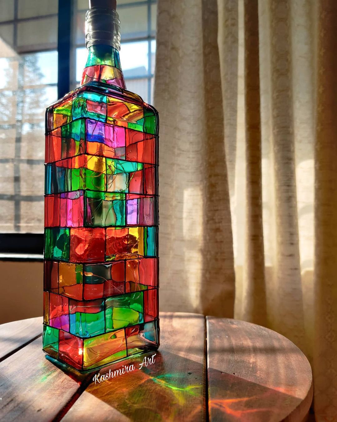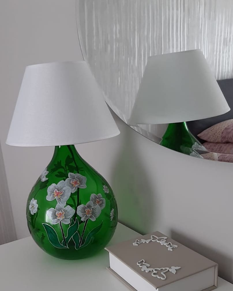 Bottiglia di qualsiasi dimensione in vetro, colori a tempera o applicazioni a piacere, trapano con punta diamantata, porta lampadina, lampadina, paralume.