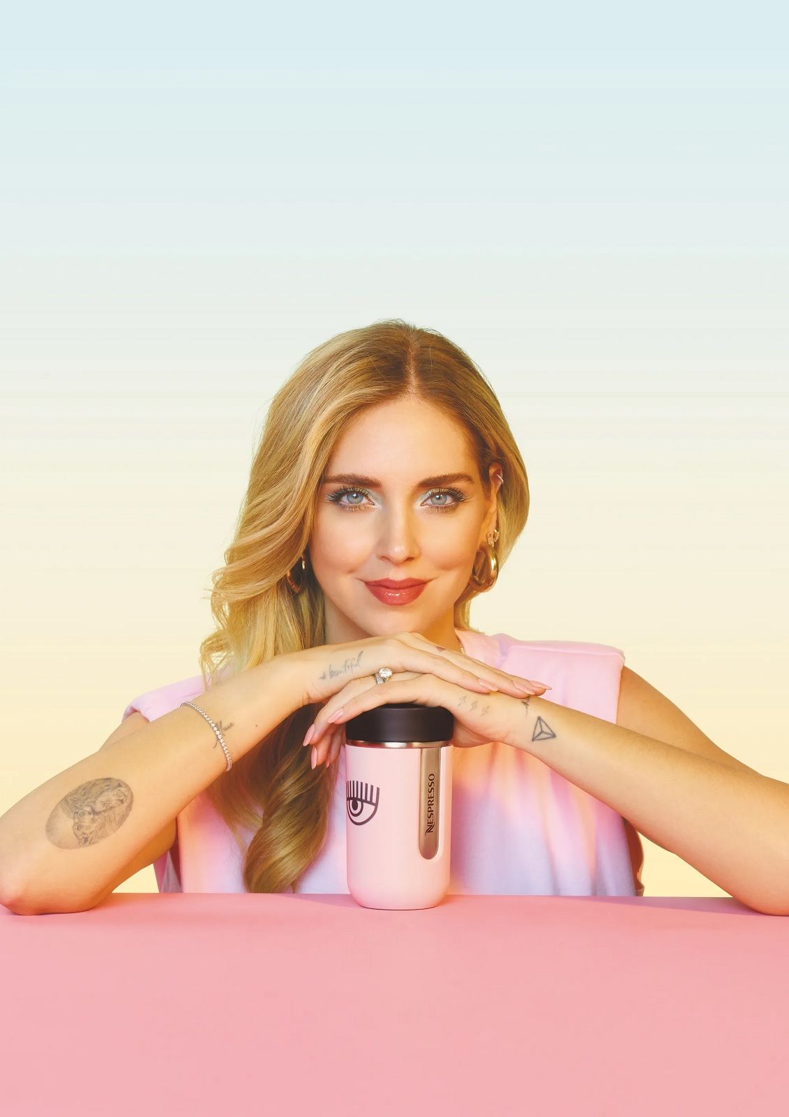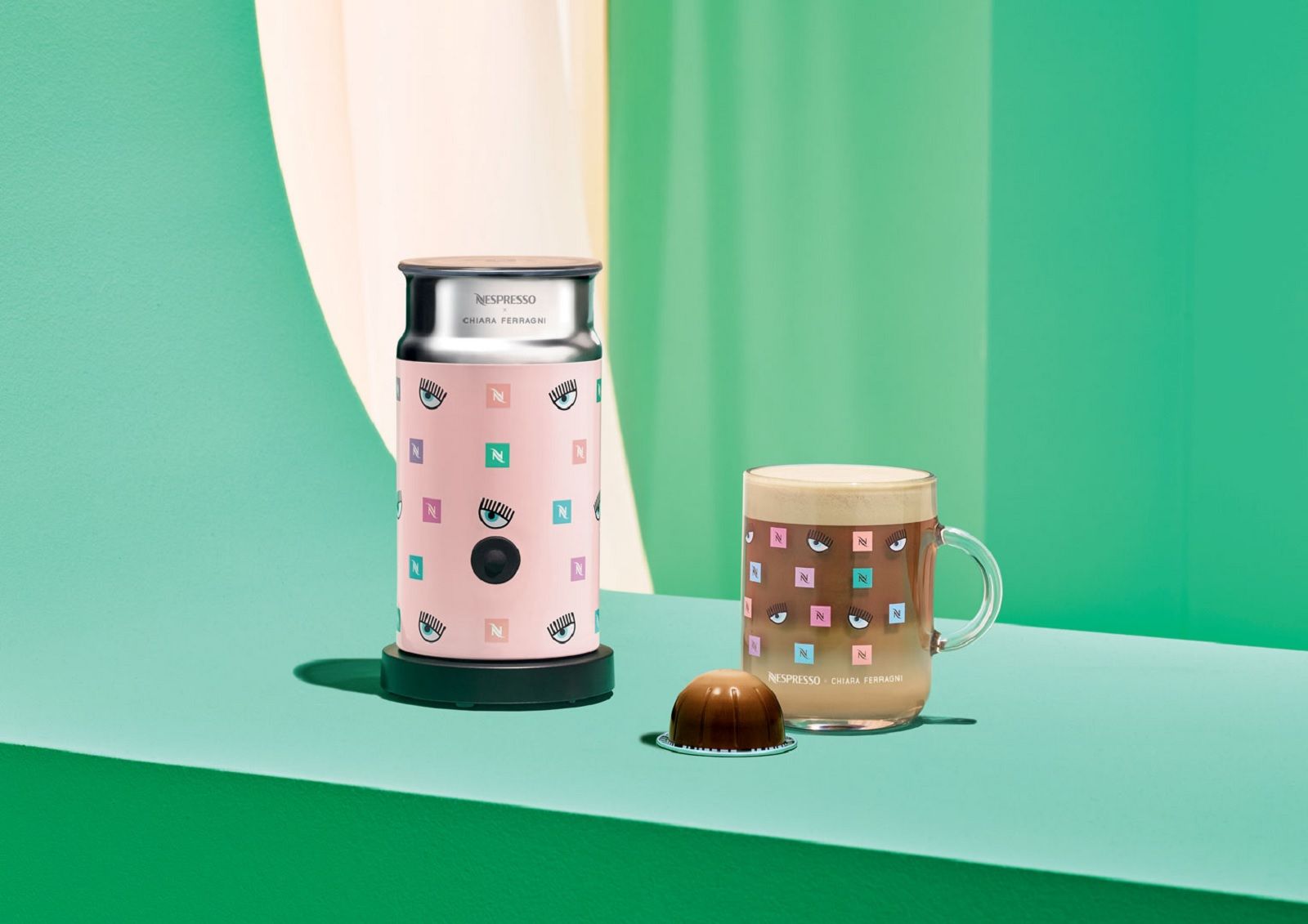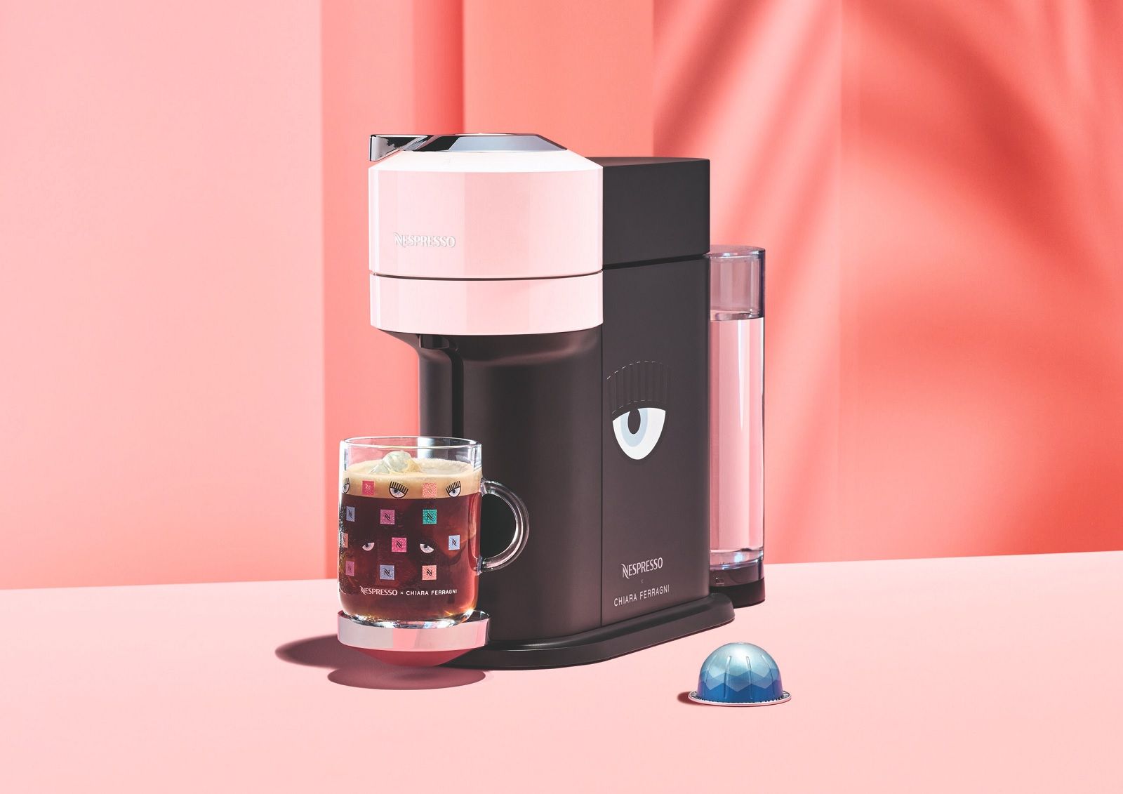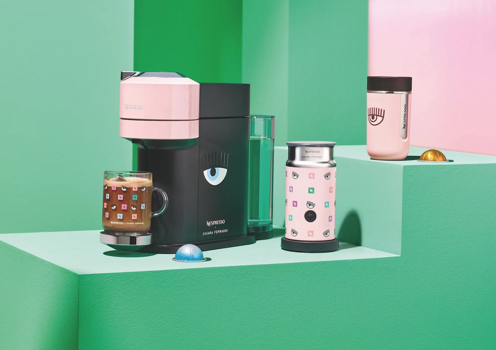 Il set da caffè in limited edition comprende le macchinette e gli accessori cult di Nespresso resi speciali dal tocco pop, girlie e dall’occhio azzurro con le ciglia lunghe di Chiara. Ogni pezzo è pensato per godersi una pausa caffè rilassante, ma anche per regalare un twist cool e femminile all’interior design delle nostre case. Tra gli item destinati ad andare sold-out ci sono la Vertuo Next rosa pastello, perfetta per preparare un’ampia gamma di caffè da condividere con gli amici; Nespresso x Chiara Ferragni Essenza Mini, un oggetto compatto e chic che eleva lo stile di ogni cucina; il nuovo Aeroccino 3 Nespresso x Chiara Ferragni bubble pink che prepara un'ottima schiuma di latte calda o fredda. Anche gli item più piccoli, come la coffee mug monogramma di Nespresso, rivisitato con i colori vivaci preferiti di Chiara o la travel mug Nomad Nespresso x Chiara Ferragni, sono super cute.
