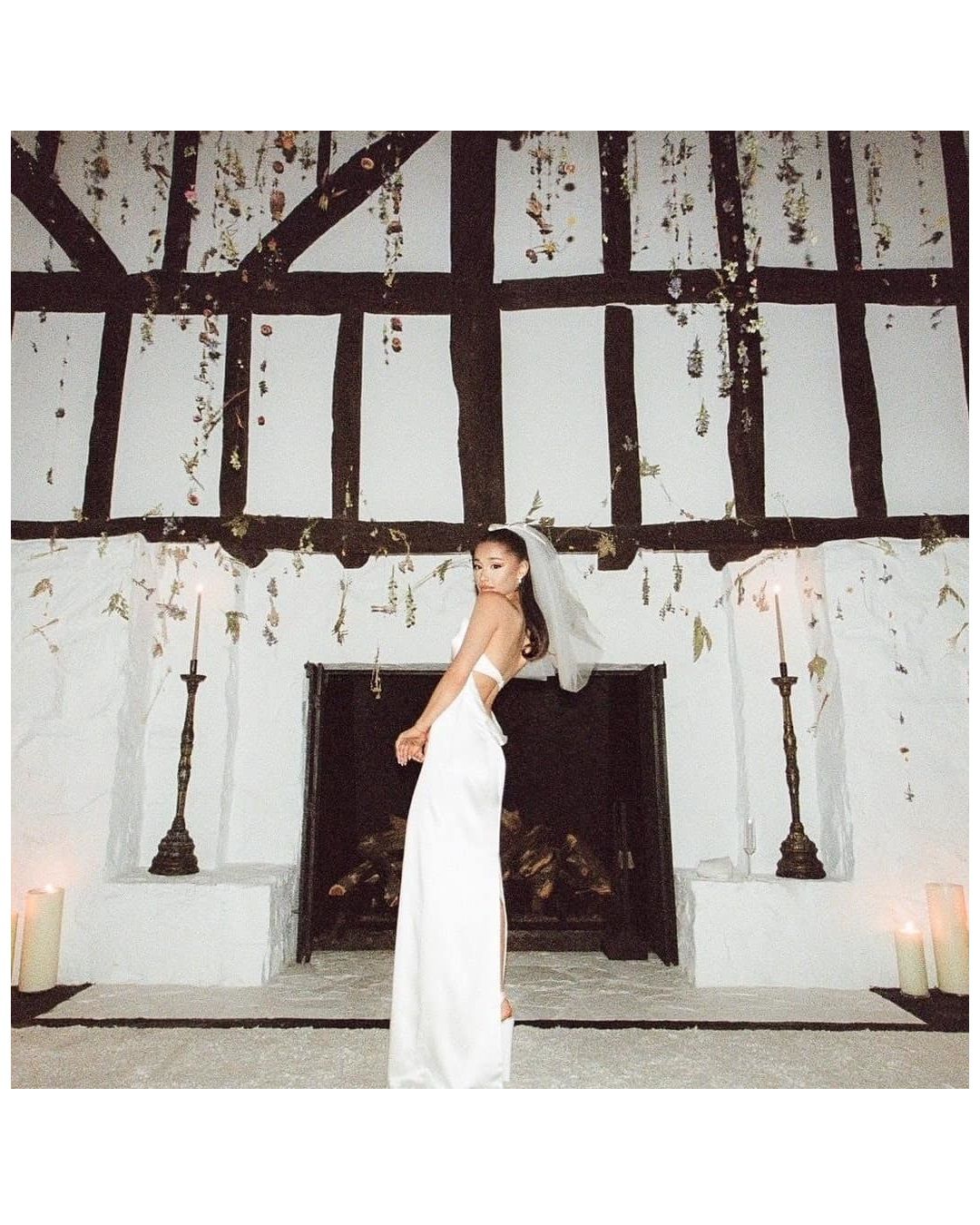 Ariana Grande ha percorso l’altare, accompagnata da entrambi i genitori, in un abito custom di Vera Wang. Vogue US ha rivelato che alcuni anni fa, durante un Met Gala, la designer aveva promesso alla cantante che, quando sarebbe arrivato il momento, sarebbe stata lei a creare il look da sposa perfetto per il suo giorno speciale. E così è stato. Il modello, in charmeuse di seta bianco giglio, era caratterizzato da un corpetto a cuore e una profonda scollatura posteriore che lasciava la schiena nuda e svelava il tatoo che la star ha sulla spalla. Un abito da sposa chic e minimale, accessoriato con platform close-toe in satin bianco Giuseppe Zanotti e un velo di media lunghezza con fiocchetto, che a molti è sembrato un omaggio a Audrey Hepburn nel film Cenerentola a Parigi. Anche la scelta degli accessori è stata minimale:orecchini di perle e diamanti Lorraine Schwartz, la vera matrimoniale e l’anello di fidanzamento, entrambi disegnati dal marito.
