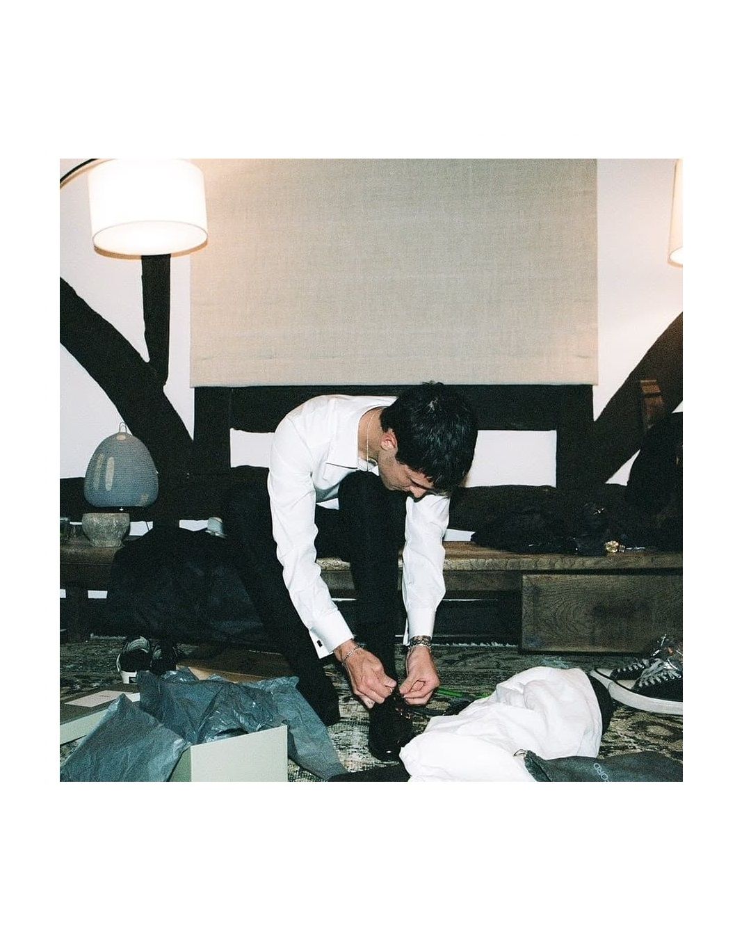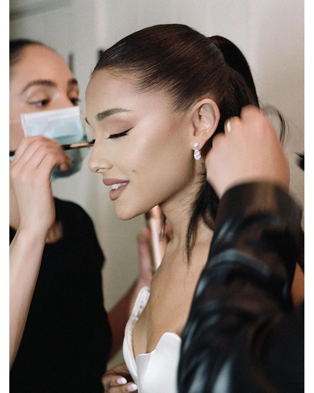 Anche nel giorno del matrimonio, Ari ha deciso di rimanere fedele a se stessa, optando per il suo hairstyle più iconico: la coda di cavallo, ma, stavolta, in versione semi-raccolta. L’hairstylist Josh Liu ha raccolto i capelli al centro della testa con una leggerissima onda che parte dalla riga centrale, fermando la coda dietro la nuca con degli elastici a scomparsa del brand ùtiles beauty. Il focus del trucco era lo sguardo. La make up artist Ash K Holm ha creato un cat-eye molto sottile, ha aggiunto ciglia finte e, infine, ha sfumato fino alle tempie un ombretto marrone che sembrava virare leggermente verso l’arancione. Anche per il rossetto Arina ha optato per la stessa tonalità mat.