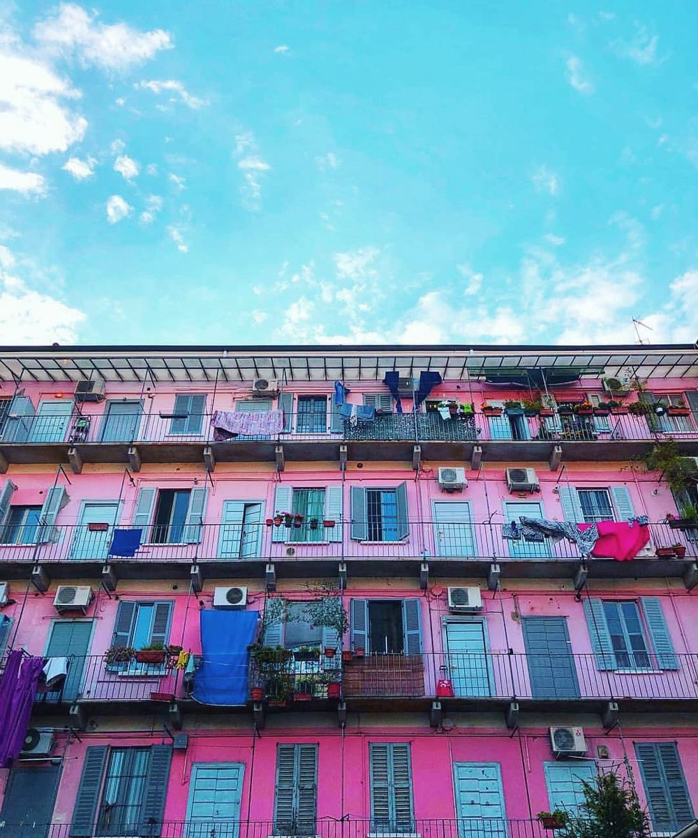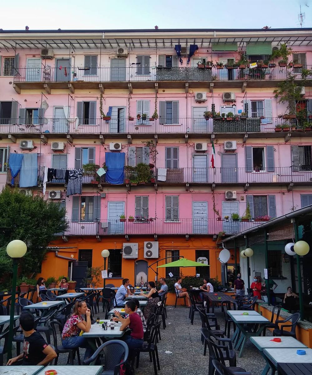 Avete presente le case di ringhiera a Milano, con i loro balconi colorati e pieni di dettagli? Sono questi palazzi, in versione rosa, a fare da cornice al locale Frizzi & Lazzi, dove l'atmosfera sembra essersi fermata alla Vecchia Milano degli anni 60/70. Il cortile, riparato parzialmente in caso di pioggia, vi farà sentire come a casa, diventando così la location perfetta per un aperitivo tranquillo dopo una lunga giornata di lavoro.