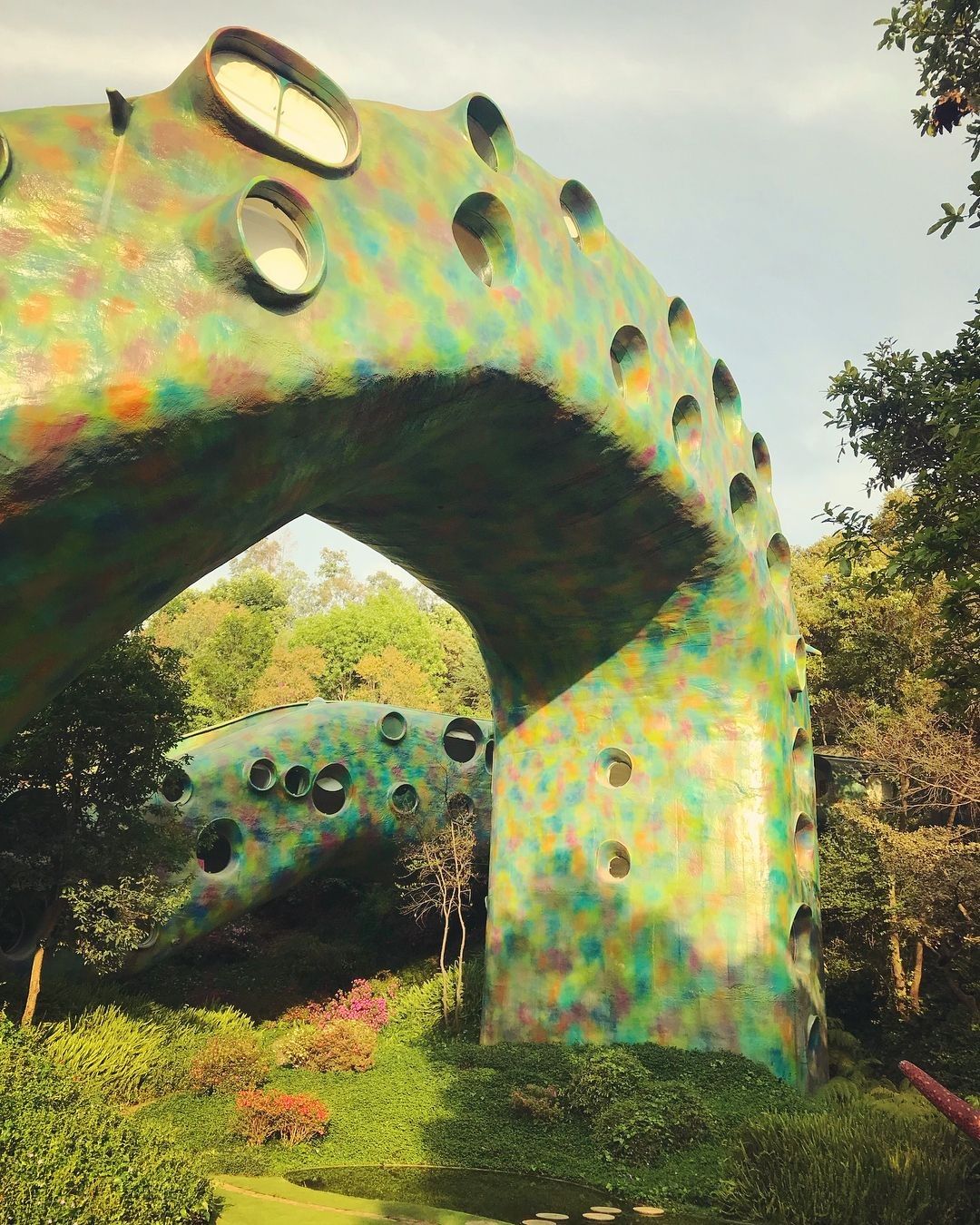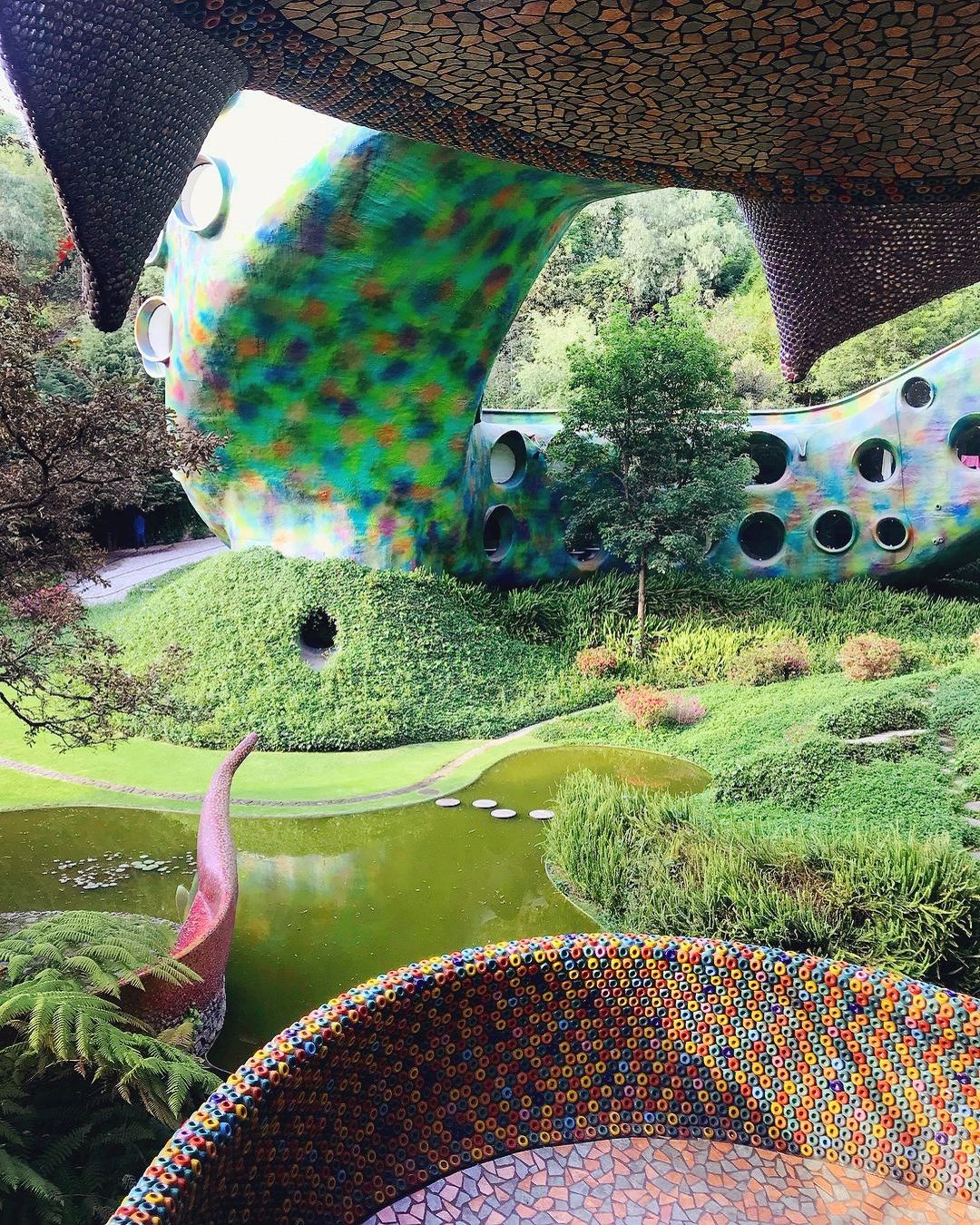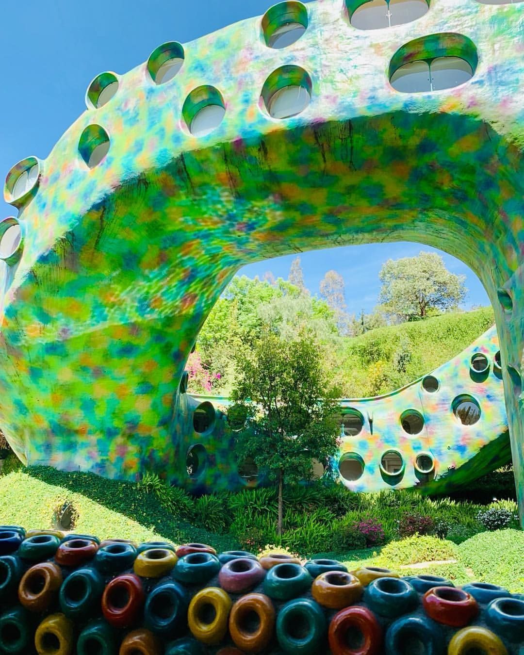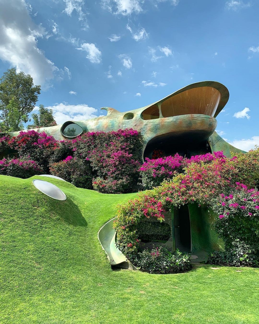 Si tratta di il Nido del Quetzalcoatl, una struttura ispirata ad una divinità mezzo uccello e mezzo serpente venerato dagli Aztechi, che occupa quasi 16 ettari sulle colline intorno a Naucalpan de Juárez, una lussureggiante area boschiva a ovest di Città del Messico. Costruita dall'architetto Javier Senosiain, la casa sembra quasi una scultura, un’opera di Gaudì, che con i suoi colori accesi trasporta i visitatori in un ambiente onirico e psichedelico. Il suggestivo edificio si aggroviglia attorno alle grotte, ruscelli, canyon e alla vegetazione proprio come farebbe un rettile e, come un vero serpente, è dotato di testa, coda e di un corpo curvo sinuoso.