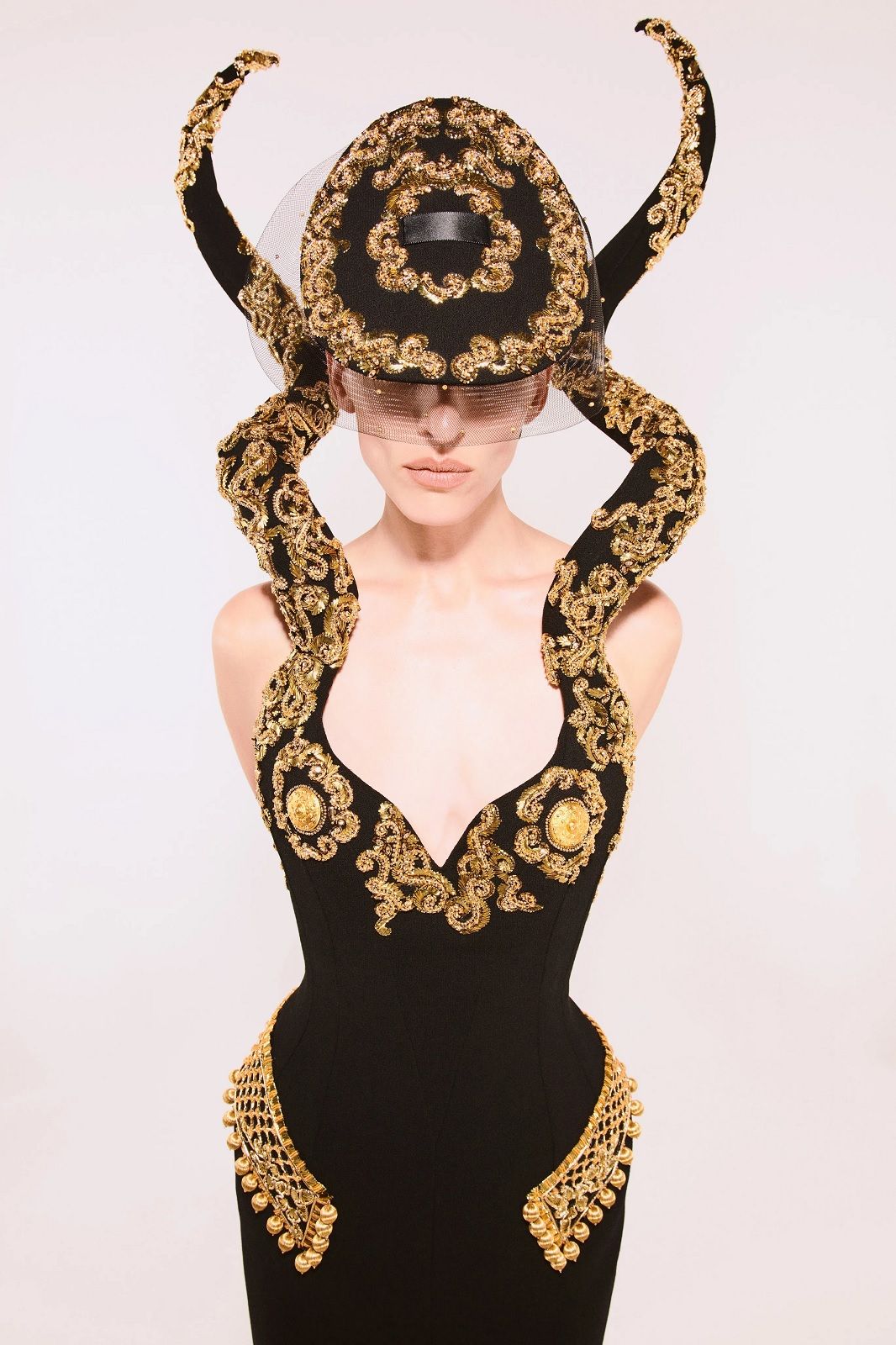 The Matador invece per la Fall 2021 Couture è un omaggio diretto al capolavoro Jean Cocteau x Schiaparelli del 1937 e la reinterpretazione delle iconiche giacche Schiaparelli del passato: giacche cropped d'ispirazione matador con maniche a botte ricamate e nappe di seta nera, dettagli di seta rosa a contrasto, conchiglie ricamate, inserti in oro dal gusto barocco. L’atmosfera della corrida surrealista si arricchisce con la rivisitazione dei tradizionali cappelli a tesa larga spagnoli e gli immancabili bijoux. Il design vive di contrasti tra duro e morbido, macchina e uomo, metallo e tessuto.