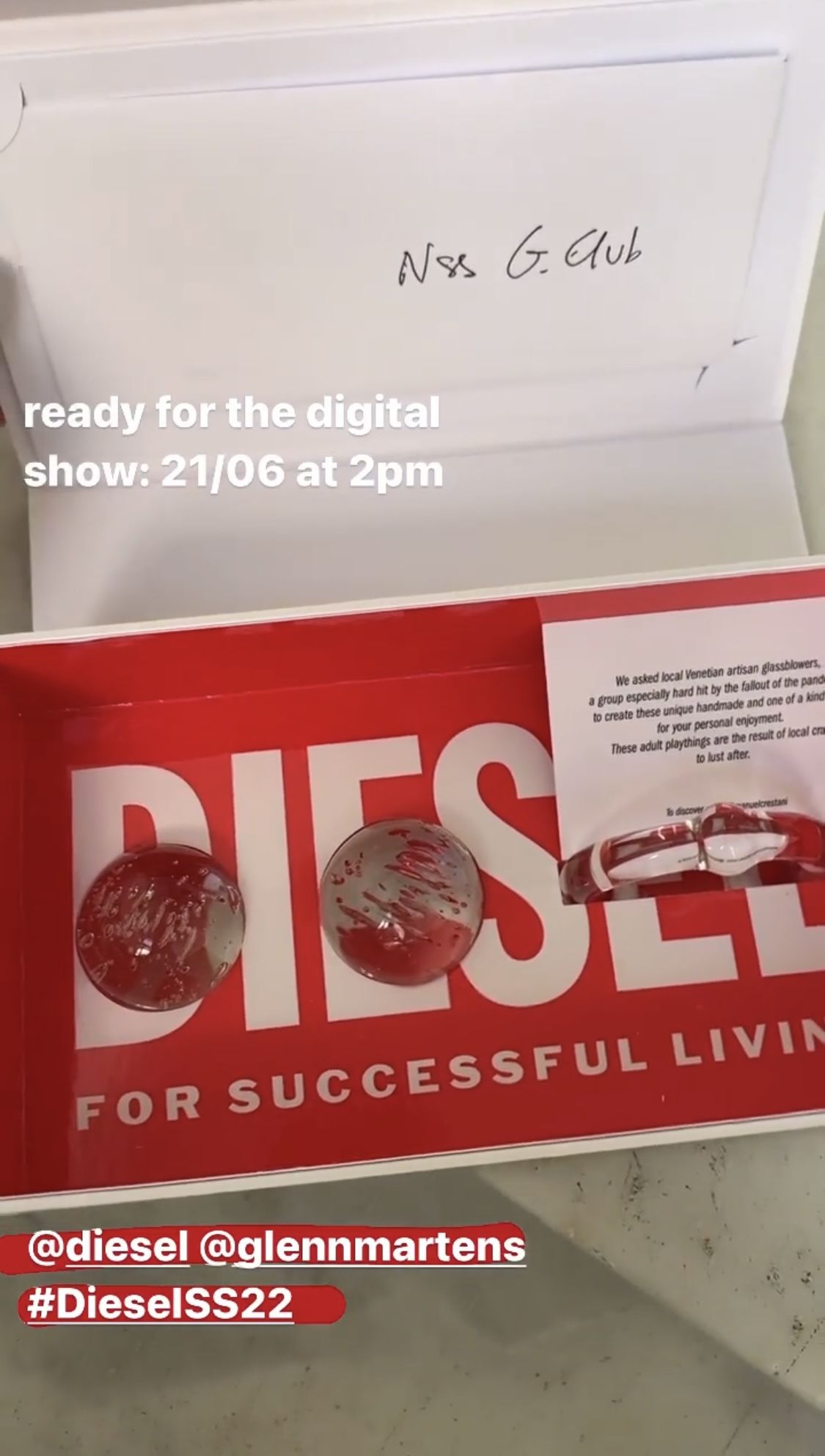 Da qui, come si suol dire, è stato tutto in discesa. Nella collezione maschile F/W 2018 Moschino ha riproposto maschere BDSM, guanti in gomma e trench in latex. E nel maggio 2018 Rihanna ha dato vita a Savage X Fenty, portando la lingerie nell’Olimpo dell’inclusività e lanciando 10 kinky items (frustini, bende, manette in marabù nastri in seta per legare i polsi e così via). Un ultimo esempio, più recente, ce lo fornisce Glenn Martens, che per la Diesel SS22 ha mandato un sex-toy in vetro di Murano come invito per partecipare alla sfilata digitale ed in allegato il messaggio: