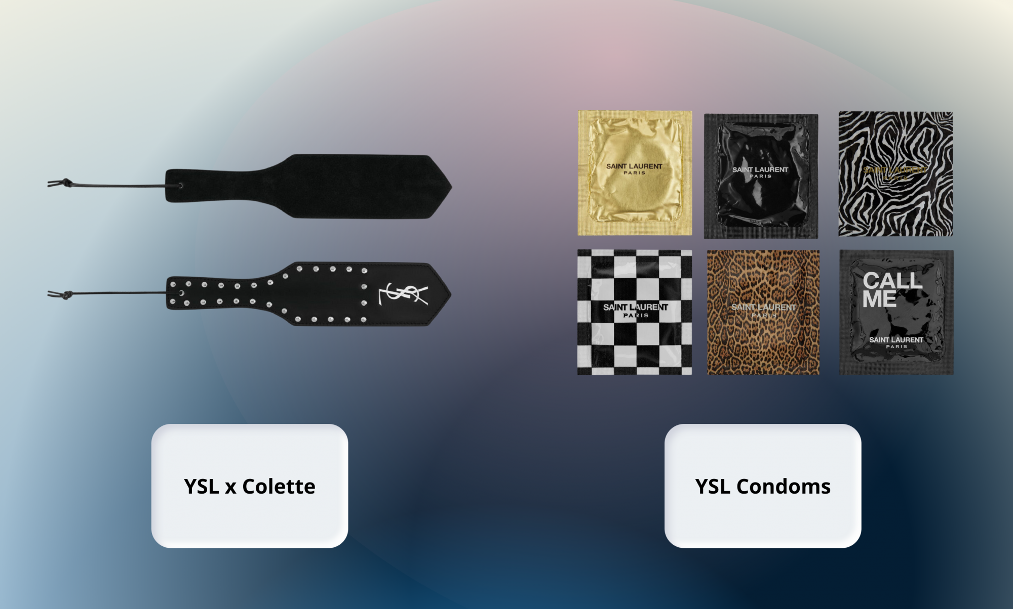 Sempre nel 2017 lo store francese Colette chiude i battenti e sceglie di realizzare una collaborazione conclusiva con Yves Saint Laurent (maison che tra l’altro avrebbe occupato il primo piano con l’ultimo pop-up store negli spazi in Rue Saint-Honoré), con una serie di oggetti disparati, tra cui uno spanking toy in pelle. Due anni dopo Anthony Vaccarello con la campagna The Love Affair ha anche proposto dei preservativi firmati Saint Laurent, con rivestimenti a scacchi, animalier, dorati e simil-latex.