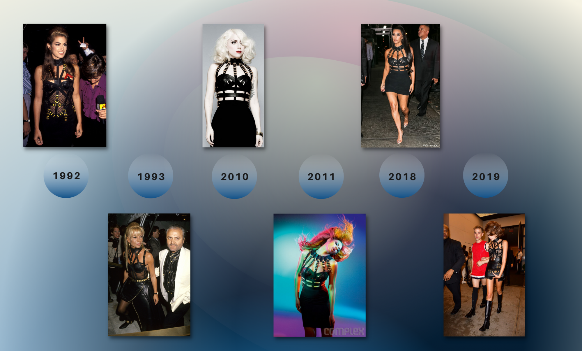Miss S&M trasla il mondo dei dungeon sui red carpet, così nel 1993, a New York, Donatella Versace fa una delle sue prime grandi apparizioni, in occasione del centesimo anniversario di Vogue, con un vestito della collezione. In seguito un’infinità di celebs indosseranno una reinterpretazione del bondage dress, come Cindy Crawford, Miley Cyrus, Lady Gaga, Kim Kardashian, Kaia Gerber e Beyoncé.