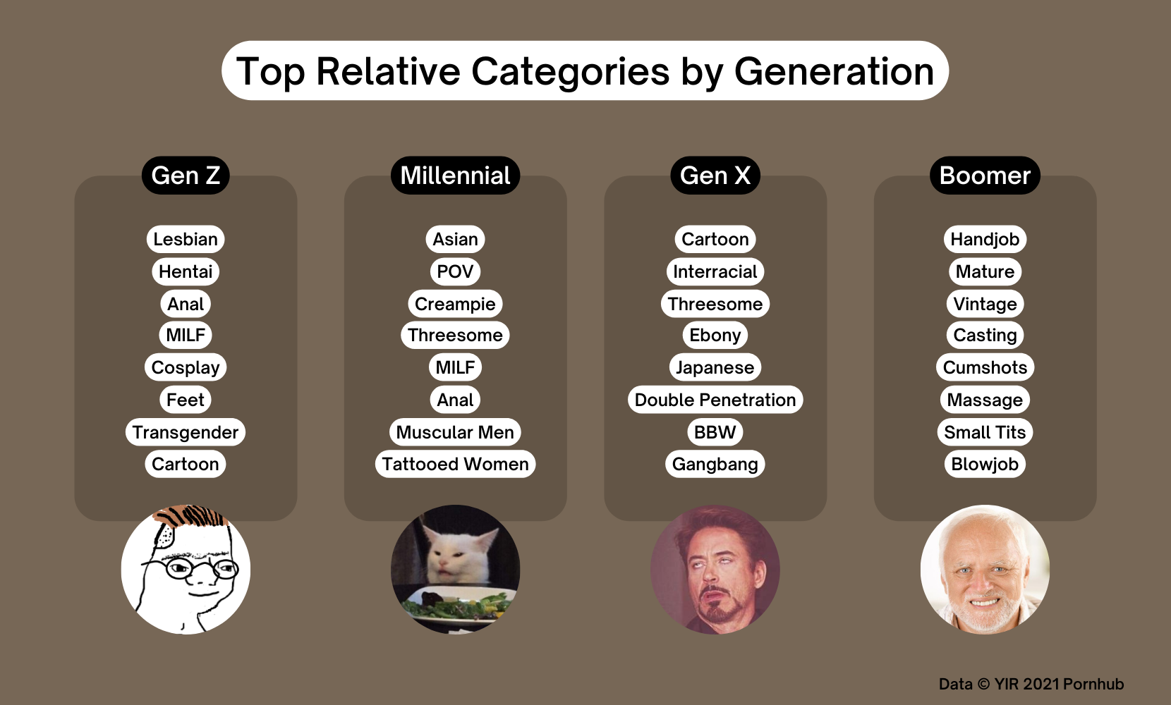 La Gen Z si focalizza sui video lesbo, hentai, cosplay e piedi. Anche i Millennial sono più propensi a guardare categorie asiatiche, video POV e categoria Creampie. La Gen X (35-54), invece, è interessata ai porno sotto forma di cartoni, ai contenuti interracial e ai threesome. Per concludere i Boomer (sopra i 55 anni) guardano handjobs, la già citata Mature e in generale i contenuti Vintage.