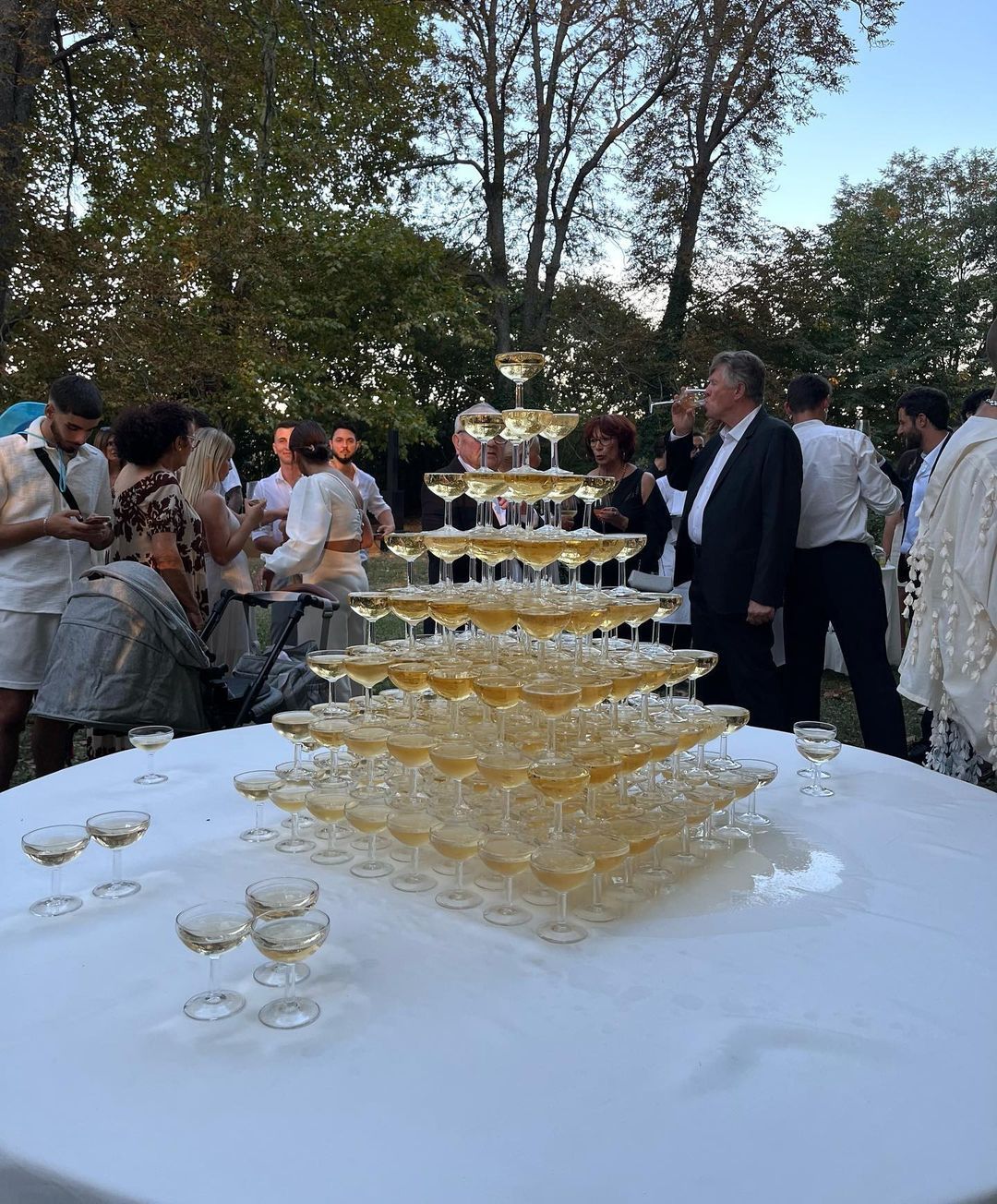 Una piramide di calici impilati uno sull'altro pieni di Champagne dominavano l'ampio patio in cui sono iniziati i festeggiamenti del matrimonio, dove gli ospiti e i novelli sposi hanno ballato a ritmo del sound curato dal padre e dal fratello di Jacquemus, che ha una band.