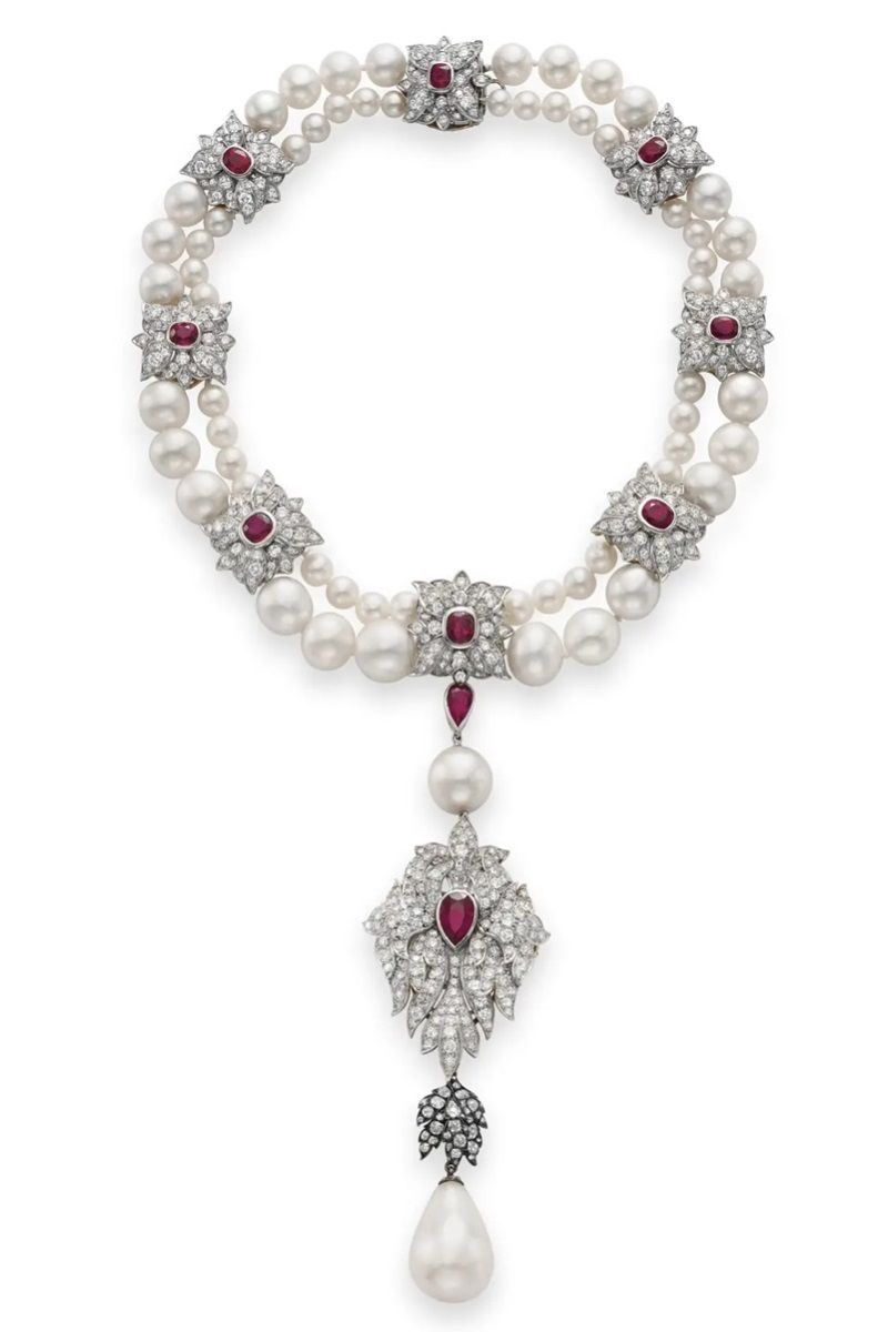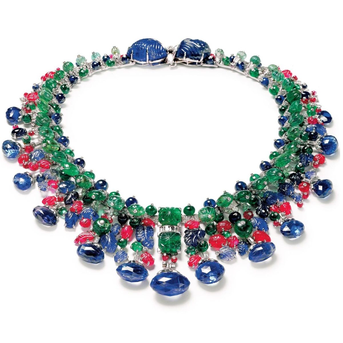Conosciuto anche come Collier Indù, la collana fu commissionata nel 1936 a Cartier da Daisy Fellowes, socialite ed ereditiera della macchina da cucire Singer che era nota per il suo impeccabile senso dello stile e negli anni '30 era considerata una delle donne meglio vestite al mondo. In seguito, nel 1963, venne modificata, ma rimane ancora oggi il simbolo della sfolgorante bellezza dello stile Tutti Frutti. Uno dei pezzi più famosi di Cartier, che ha contribuito a lanciare il trend "Art Déco" della Maison, il gioiello è composto da dozzine di zaffiri, rubini, smeraldi incisi o scolpiti a forma di foglie, germogli e bacche, e perle di diamanti incastonati nel platino. Il pezzo fu indossato solo una volta dalla Mrs Fellowes e, alla sua morte, passò nelle mani di sua figlia Emmeline de Casteja, che lo rimodellò drasticamente.