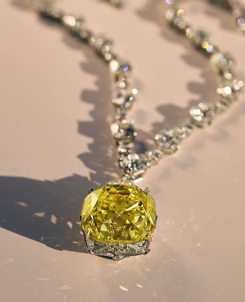 La gemma è stata scoperta nella miniera di Kimberly in Sudafrica nel 1877 e venne acquistata l’anno seguente da Charles Lewis Tiffany per 18mila dollari, che la fece tagliare nell’attuale forma a cuscino con 82 sfaccettature. Fino ad oggi, il gioiello è stato indossato almeno cinque volte: dalla socialite Mrs Mary Whitehouse ad un gala di beneficenza nel 1957; da Audrey Hepburn per pubblicizzare Colazione da Tiffany (che la sfoggiava incastonata in una collana Ribbon Rosette del gioielliere Tiffany Jean Schlumberger); Lady Gaga sul red carpet degli Academy Awards 2019, da Gal Gadot nel film Assassinio sul Nilo del 2022 e da Beyoncé per la campagna pubblicitaria di Tiffany & Co del 2021.