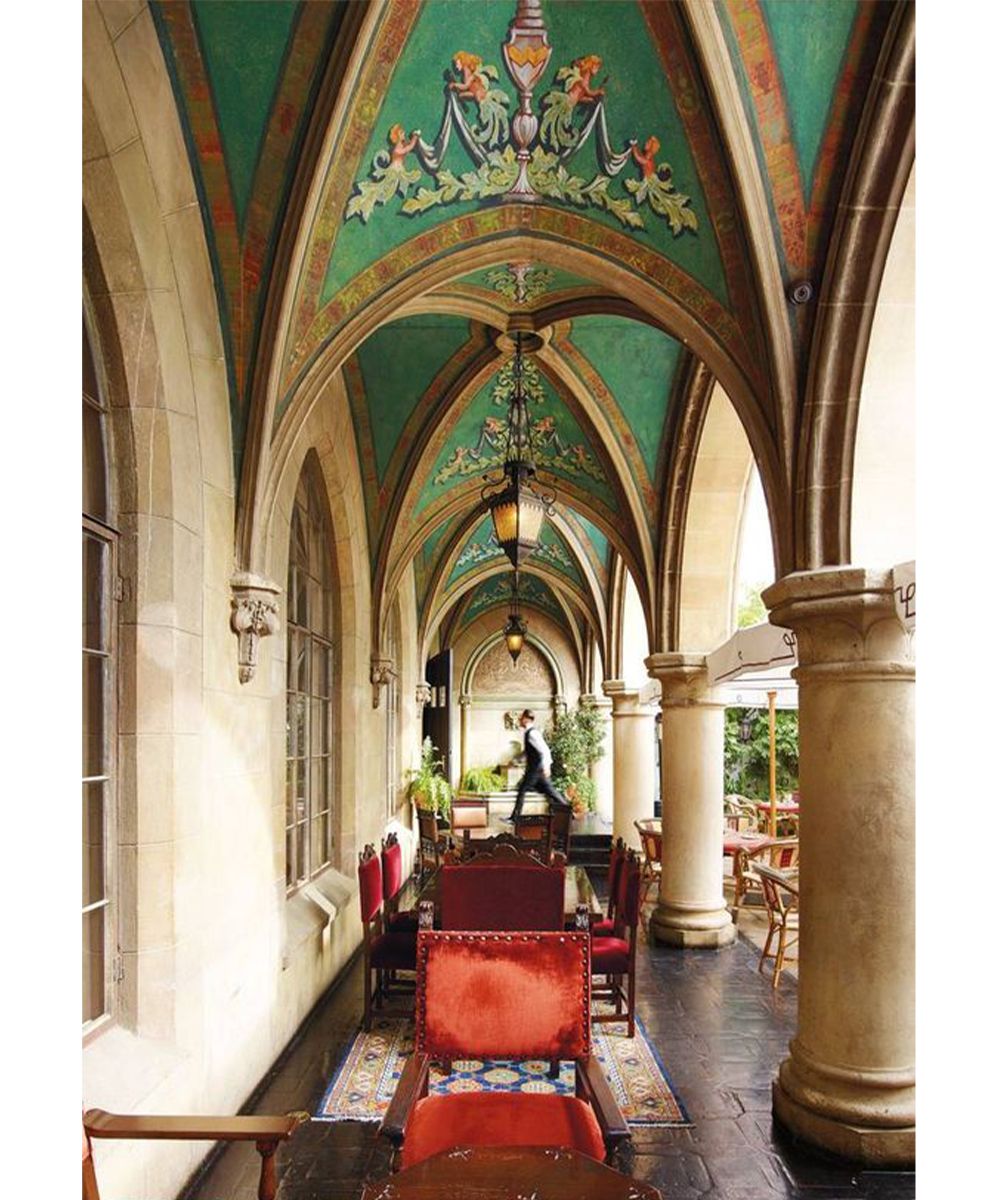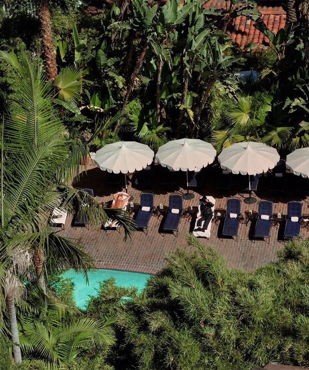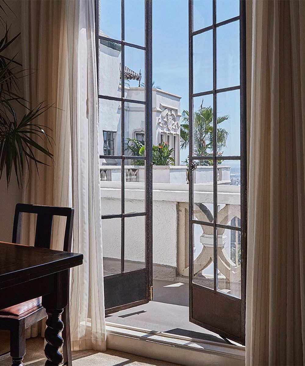 L’estetica francese simil-gotica, in marmo bianco e grigio scuro, è liberamente ispirata ai castelli medievali come lo Château d'Amboise, situato nella Loira, che ha rubato il cuore del fondatore Fred Horowitz. Le finestre ad arco, il colonnato a volta, i due fianchi dell'edificio che si ripiegano su un cortile verde rendono lo stabile una vera e propria fortezza di lusso, in pieno gusto e stile californiano. Il design degli interni crea un'atmosfera sobria e riservata, in cui ci si sente al sicuro da sguardi indiscreti: la luce fioca della hall cade dolcemente su finti broccati e divani di ispirazione vintage, selezionati dallo staff per sembrare che siano sempre stati lì. I soffitti damascati e l’armonia tra il verde e la roccia antica trascinano gli ospiti nella maestosa tenuta di influenza europea, a metà tra l’esoterismo spagnolo ed i dettagli aristocratici francesi, mantenuto dal nuovo proprietario André Balazs. Sono gli accoglienti spazi comuni come la hall, la piscina ed il rigoglioso giardino a rendere l’anima glam di una Vecchia Hollywood difficile da imitare oggi.
