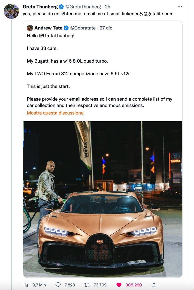 "Ciao Greta Thunberg Io ho 33 macchine. La mia Bugatti ha un motore W16 da 8 litri con turbo quadruplo. Le mie due Ferrari da competizione hanno un V12 da 6 litri e mezzo. Questo è l’inizio. Per favore, inviami il tuo indirizzo email così che possa mandarti una lista completa della mia collezione di auto e delle loro enormi emissioni".